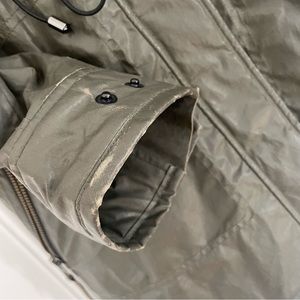 signs of wear: rubbing on canvas sleeve cuffs. one interior snap that fastens the fur vest to the outer jacket on the lower left side is detached (pictured) but doesn’t affect appearance/ not visible when worn. Interior fur vest and hood have no rubbed or missing fur from wear.
