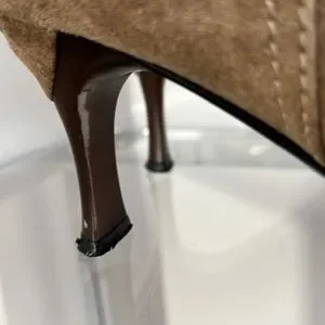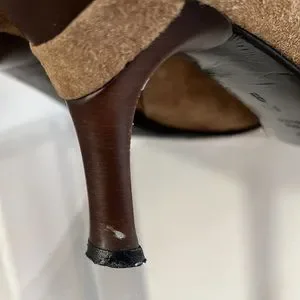 These boots have been lovingly worn and there is evidence. The suede has been rubbed at the toes of the boots. See pictures. And the heel tip caps need replacement. Otherwise, these boots are in good condition. If you need more photos, just ask!