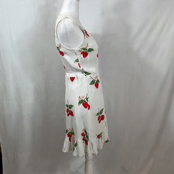 Rails Dress Size XS. Wrap Dress Ties at the Waist. Adorable Strawberry Print. Lightweight Fabric. Excellent Preowned Condition. Very Faint Pink Mark on Back of Dress. Hard to Notice See Photo.