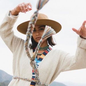 This textured organic cotton duster features a rope belt and kicky fringe with bold trim inspired by classic Apsaalooke stripes and traditional Crow beadwork. This piece was designed in collaboration with Native American fashion designer Bethany Yellowtail and celebrates her Crow heritage.
