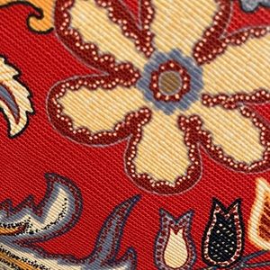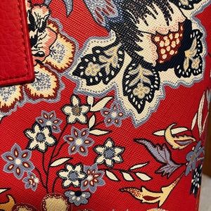 Talbots Red Pepper Multicolor Floral Tote, in vegan Safiano, solid red bottom & handles, gold tone zipper. The pattern has a red background with a mix of flowers in colors ranging from denim blue, navy blue, pale yellow, off white, golden yellow, and salmon pink. The spacious tan fabric lined interior has a zip pocket and two slip pockets. From a smoke free home, please remember color varies by device.