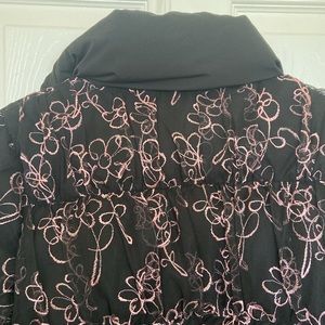 Super cute and one of a kind. Signature pink flowers with ruffles make this warm puffer fun and playful. Some marks around the neck that should come out with dry cleaning. See photo.