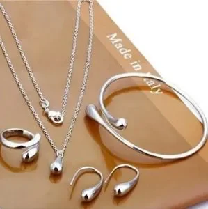 925 Sterling Silver Plated Alloy Waterdrop Jewelry Set Bracelet Necklace Earrings and Ring