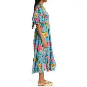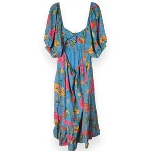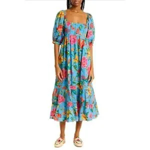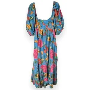 FARM RIO TOUCANS GARDEN MIDI DRESS IN BLUE Womens Small