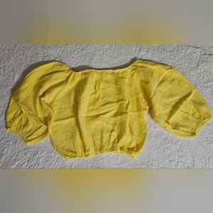 Cropped silhouette top can be worn both off the shoulder or up on the shoulders. Bateau neckline and voluminous three-fourth sleeves.