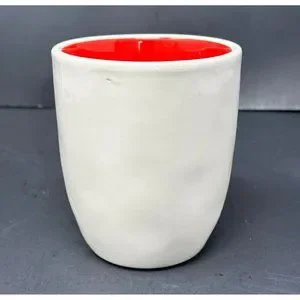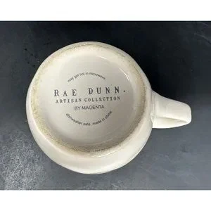 Festive Rae Dunn mug with her signature typewriter font spelling out Cheer. in red on a white field, with a red interior. This sturdy mug measures 4 ½ ” tall, 3 ½ ” opening, 4 3/4” inches across (including handle) and will hold 20 ounces of your favorite beverage. Marking states “May get hot in microwave | Rae Dunn | Artisan Collection | By Magenta | Dishwasher safe. Made in China.”