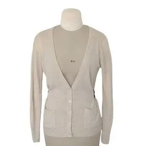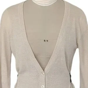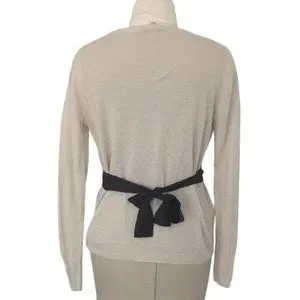 This is a bone coloured linen cardigan with a black satin ribbon tie by Sandro Paris.