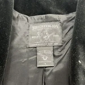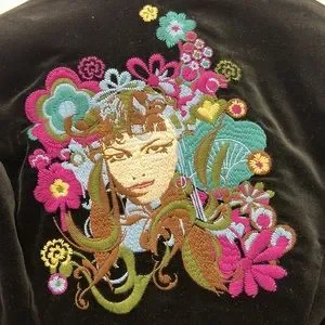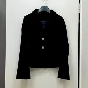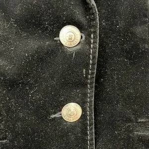 Stunning velour blazer. I wore this less a handful of times and it’s in amazing condition. The embroidery on the back is just gorgeous. The buttons are silver with the brand engraved on them and the velour is so soft. The bold stitching adds to the detail of the blazer. I paid over $300 for this jacket.