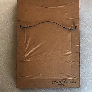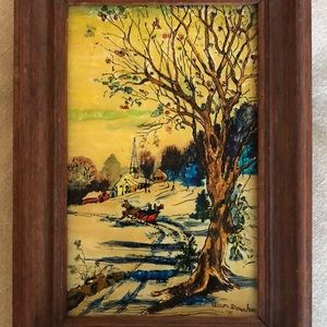 Vintage winter scene foil tinsel reverse painted artwork from 1976, artist signed - Ellen Donahue.