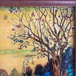 Vintage 1976 Tinsel Foil Reverse painting - winter scene