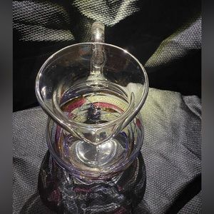 This vessel features a flared mouth which tapers towards the rounded base. It is decorated with a spontaneous motif of cobalt threads, accented with blue, amethyst, and amber details. Height 8 3/4" and 6" at widest point.