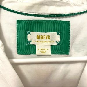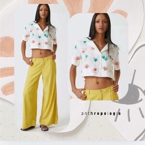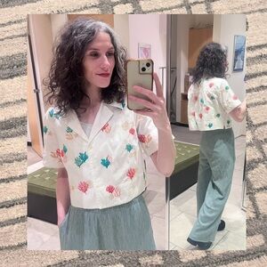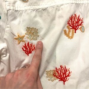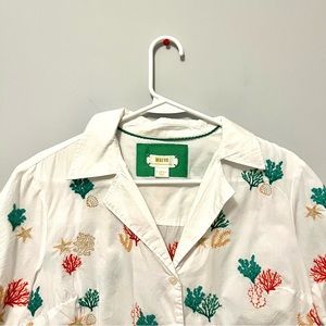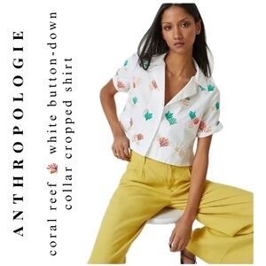 Anthropologie Maeve white cropped button-up short sleeved shirt with collar & super cute colorful coral reef 🪸 embroidered designs!