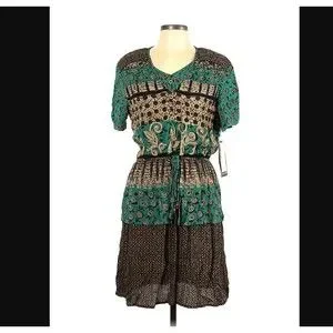 Vintage Carole Little “View Point” rayon dress featuring a striking mixed panel print in earthy green, brown, beige, and black tones. Designed with a flattering drawstring waist finished with wooden bead accents, a button front bodice, and softly padded shoulders for a classic 90s silhouette. Lightweight rayon fabric drapes beautifully, making this an easy boho statement piece perfect for everyday wear, travel, or festival styling.
