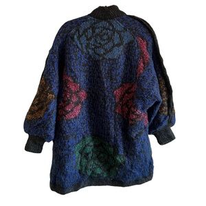 Wool/Acrylic/Nylon heavy knit long length sweater. Rose motif with ribbed sleeve cuffs. No size tag. Fits like a L/XL.