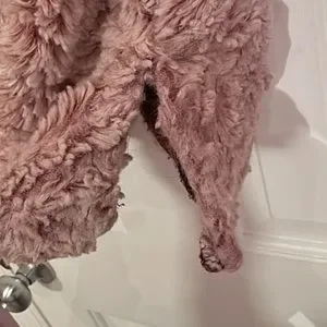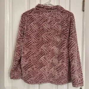 Pink fuzzy Pullover, soft and fluffy, has a zipper at front top, has pockets also has small slits on sides, I think the pullover is cute, outside looks good, light pink over dark pink, inside has pilling is a lightweight pullover, pit to pit measurement 20 inches, . B67