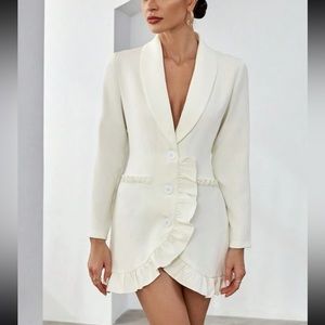 Off white v neck ruffle hem button front mini blazer dress