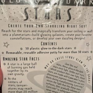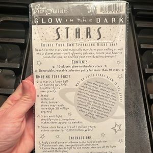 This is a fun way to accessorize your room! These are brand new with the adhesive putty. These glow-in-the-dark! I am including 19 additional stars as shown in last picture. They are from another pack that we used in my daughters room. As always smoking pet free home. Same-day shipping!willing to negotiate prices.