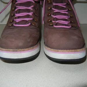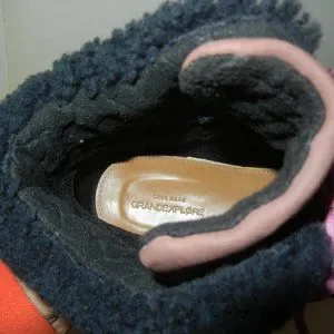 beautiful chocolate brown upper with black padded shearling at the top for comfort