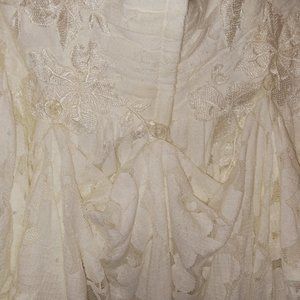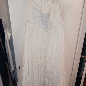 Beautiful lace. Strapless. No belt. Floor length (with shoes) at about 5'7". Is bustled for long train at ceremony.