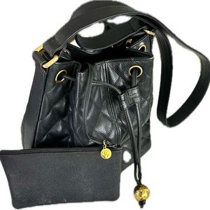 CHANEL Caviar Bucket Bag with inside Pouch- Gold-tone hardware - Black quilted caviar leather - Single flat shoulder strap - Smooth tone-on-tone leather lining with drawstring at top - Vintage Overall pre-loved condition: very good. External condition: Very good. Slightly relaxed shape. Interior condition: Very good. Made in Italy/France- Dimensions: Height 23 cm Width 21 cm Depth 14 cm Shoulder strap height 48 cm.