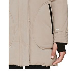 “Sandstone” color (NOT black). SAUNDRA by SOIA & KYO is a slight A-line, mid-length down coat with a dramatic face-framing hood with removable fur trim. The outer shell is water-repellent and water-resistant to ensure you stay extra dry during harsh weather. The vanilla sherpa-lined hood adds extra warmth and the signature stretch printed lining provides extra comfort.