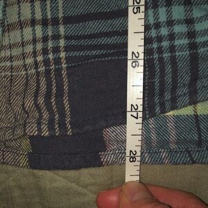 2/$10. Plaid button up Boyfriend shirt, with two breast pockets. Blueish green, white, grey, black and pink. Pit to pit is 23.5 inches. Shoulder to hem is about 28 inches. See pictures.
