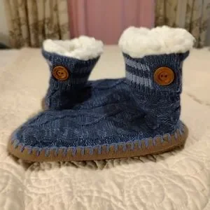 New Blue knit Muk Luks Booties, fully lined with fluffy white fur. Gripped soles. Button details on Fold over knit cuff.