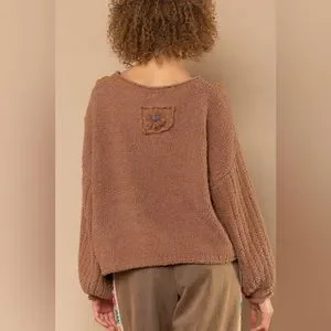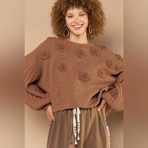 LAST ONE POL Brown Textured Knit Flower Patchwork Sweater Top