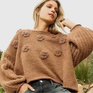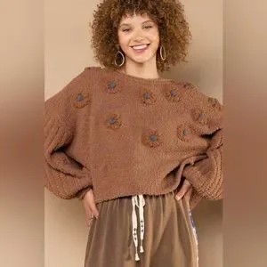 Stay Stylish Outdoors in our textured, brown knit sweater with flower patchwork designs.