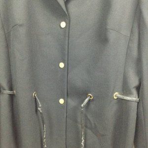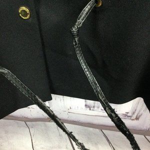 Beautiful black blazer from Les Copains. Gold front button closure, turn down collar and imbedded gold rings for a belt. In good used condition although the belt will need to be replaced. It's pretty worn, please see photos.