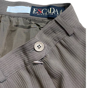 Vintage 80s Escada women's high waisted pencil skirt with ribbed detailing. Color is a khaki or army green shade. Button and zipper at side. Small slit at back. 100% wool skirt. Lined. Perfectly pristine condition.