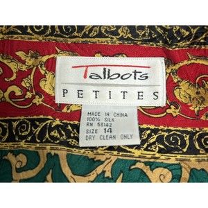 Vintage womens Talbot colorful floral print jacket, 100% silk- size 14. **see measurements -while this is a petite, it runs small for a size 14**. This jacket has one decorative gold button at the neck, other buttons are hidden. Shorter style- hip length, long sleeve and fully lined with shoulder pads. Laid flat to measure. Bust (pit-pit): 21, hips (side to side): 21, shoulder to shoulder: 17, sleeves: 22.5, Length (back): 21.