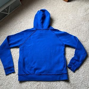 Buffalo Bills NFL football ladies hoodie sweatshirt. Blue with BILLS in red and white screen print and Bills logo on front. Frayed look around seems. Ladies size Small.