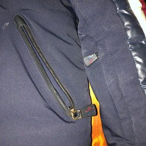 Moncler G32-003 Norme Cen NF EN 12934, size 6. Used, in fair condition. Pre-owned authentic Moncler puffer jacket. Interior is red, exterior is dark navy blue / black. Three zippered exterior pockets.