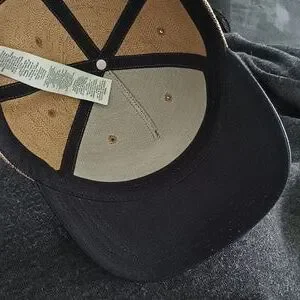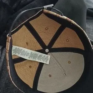 Tan canvas and Black leather hat, cap, baseball cap with brim.