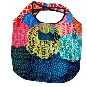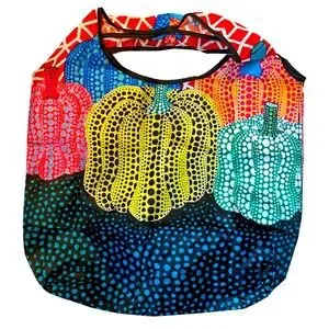 These bags are not only gorgeous but so functional and spacious. The front has small pouch if you want to fold it up teeny tiny to pack or you can use the pouch to hold something. Very strong for groceries etc. very vibrant classic Yayoi Kusama pumpkin/gourd design.