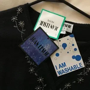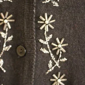 From my mom's closet, this beautiful sweater is edged with silver threaded embroidery and silver beads. Made to look like a cardigan, the button down front is attached to a built in shell. Originally priced at $62, it was purchased on clearance for $15.50. Made from 55% Ramie/45% cotton, this sweater is hand washable. Original tags are attached and includes a spare button.