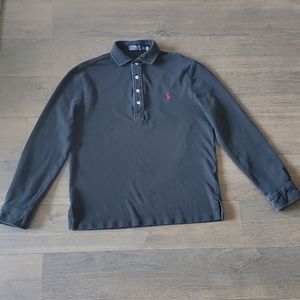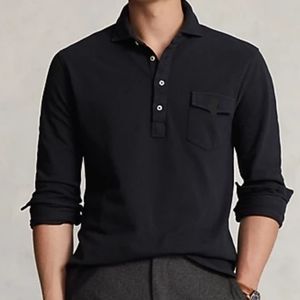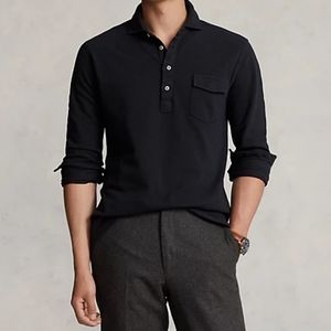 Classic straight fit polo shirt reinvented - Ralph Lauren, black color, mesh 100% cotton, 4 buttons front closure, collar at the neckline, long sleeves with button closure all-year-round shirt. Wear it over or tucked in, alone or under any jacket or blazer. Dress it up for business casual or dress it down for more more sporty look. Red color pony logo embroidery.