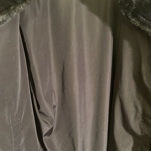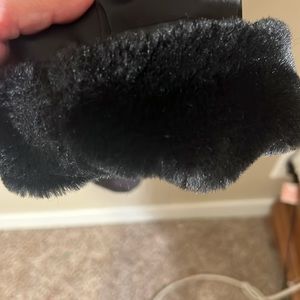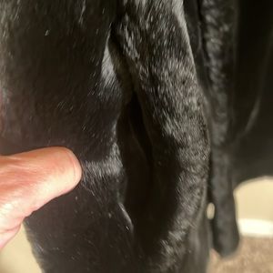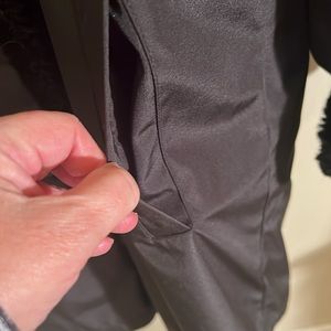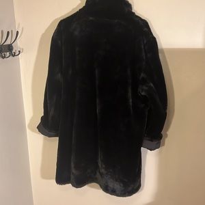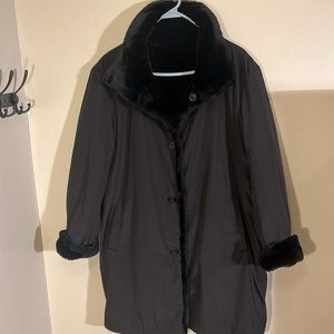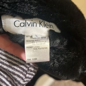 preowned Calvin Klein black faux fur reversible winter coat women’s size large. this coat can be worn with the fur on the outside or the nylon fabric on the outside. it has pockets on both sides, either side that you choose to wear it. Very good condition