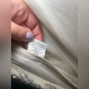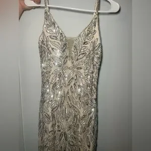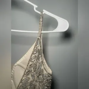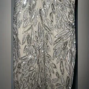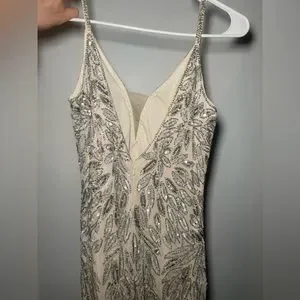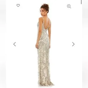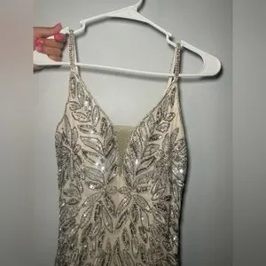 An elegant long gown dress is crafted in a leaf beaded net with spaghetti straps forming a mesh panel with a deep V-neckline. This fitted dress finishes with a slight sweep train.