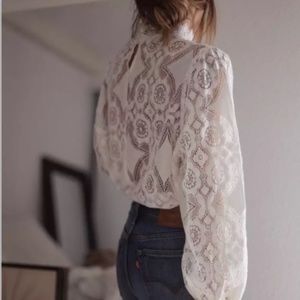 All over lace scalloped edge high neck long sleeve sheer top blouse white button at back of neck