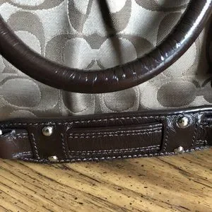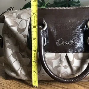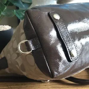 This beautiful Coach Satchel bag is amazing, she’ll carry all your stuff, chocolate brown and tan with silver accents all around, just a gorgeous classic C bag. It’s convertible since the shoulder strap is removable so that you can carry her on your arm, the shoulder strap can be stored underneath the bag in the snap straps. Very minimal wear to even call out…she’s just about perfect! One zipper and one pocket on the exceptionally clean interior….you will love this!