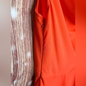 Marineblu Tangerine Orange Rhinestone Cocktail Dress Size Small. Invisible Zipper in the Side of Dress. Draping in the back is also see thru. Pleating and Rhinestone Collar in the front with a Keyhole. Long Tail in back Waist 13 1/2” length in front from shoulder 33 3/4” back is 40” The Dress has a Beautiful Flow quality. Would be Perfect for a party or Prom.