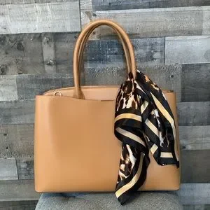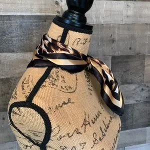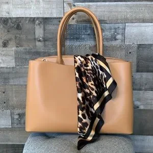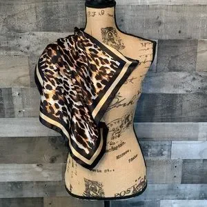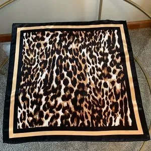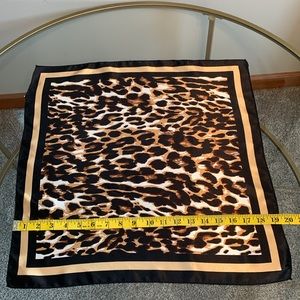 Beautiful leopard scarf, tag is cutoff but it’s 100% polyester. Some fraying along edges as pictured. A classic, chic scarf! (Tote is for display only.)