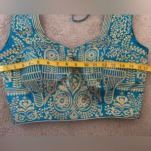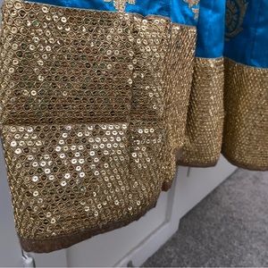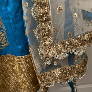 This stunning one of a kind turquoise lehenga was custom made for me in Houston at an authentic Indian wedding shop. The top is size 36 with padded cups (no bra needed!) and a side zip. The skirt has a side zip with an adjustable tassels. It fits a size 4-16 at least. It has stunning gold sequins and embroidery and a heavy lined skirt for volume. The scarf is hand embroidered with gold details and gold trim.