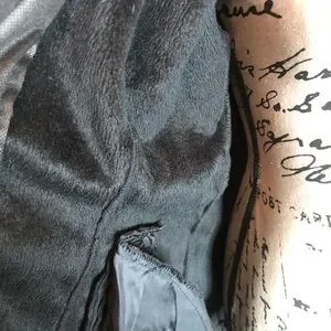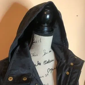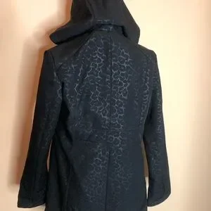 Black on black leopard, hood, fuzzy fleece lined, gold snaps, full zipper