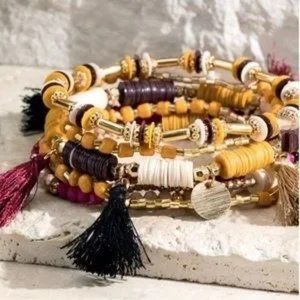 Handcrafted multi layered stretch bracelets with mixed lustrous gold tone beads and acrylic beads. Charms and tassel embellishments.
