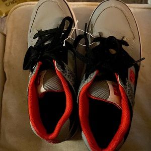 DC skateboard shoes. New. Size 7. Black and gray with red embroidered DC on side and back. Leather upper. Rubber sole.