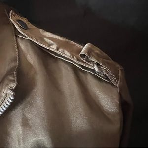 Olive green satin jacket by Mileage SZ small. Features cropped gathered waist, zipper pockets and accents, button sleeve cuffs. Made of lightweight polyester. Gently loved and in good condition. Does have a small flaw as pictured but is not really noticeable.