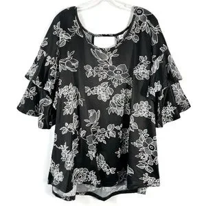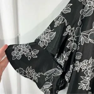 Stem & Vine Black & White Textured Floral Ruffle Sleeve Plus Size Blouse 2X